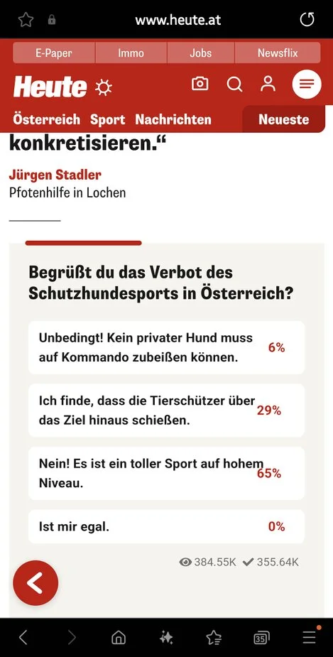 Eine aktuelle Umfrage der Heute-Zeitung spricht eine klare Sprache: Nur 6% der Abstimmenden unterstützen das Verbot des Gebrauchshundesports. 94% stehen hinter dieser traditionsreichen und international anerkannten Sportart, die seit Jahrzehnten für verantwortungsvolle Ausbildung und sichere Hundehaltung steht..................